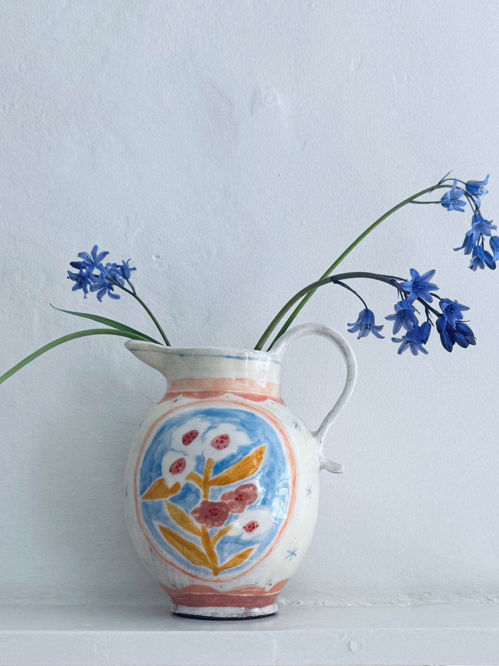 The Spring Jug is hand built and sculpted in terracotta, illustrated by hand with a white slip and underglazes.