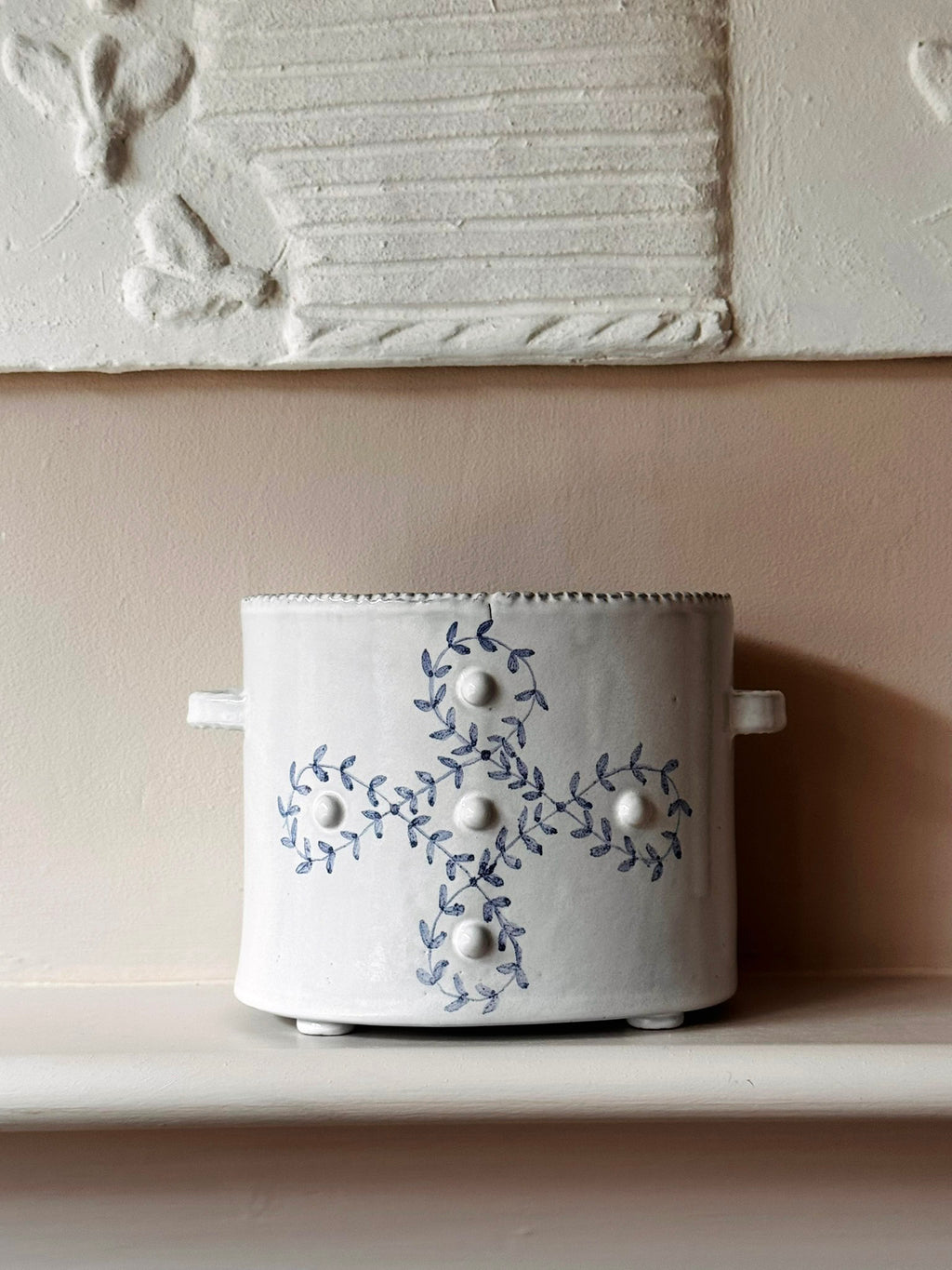 Each jardiniere is unique, through form and decoration. Dotted textures are a nod to Emily's passion for eighteenth-century creamware, whilst the hints of chinoiserie in the application of blue brushwork against a white glaze remind us of the historical narratives deeply embedded in her work.